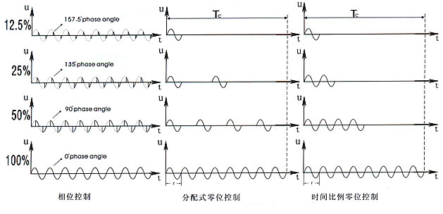 2.控制模式。综观国内外可控硅电力控制器产品,控制模式无非就是两种:相位控制和零位控制(分配式零位控制、时间比例零控制)。三者之间的比较请看以下图表。