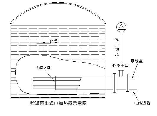 泵出型电加热器主要适用于加热贮罐内各种粘性介质,使之局部变稀后可以用泵顺利抽取。